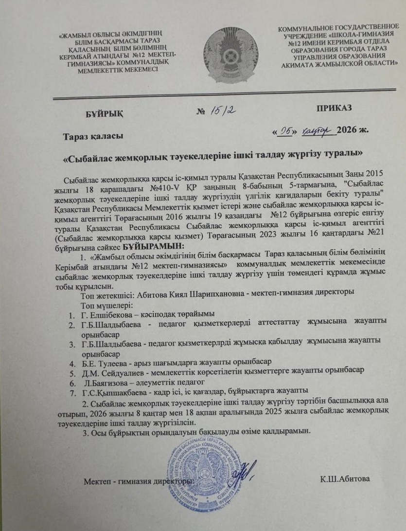 Бұйрық Сыбайлас жемқорлық тәуекелдеріне ішкі талдау жүргізу туралы » СШ №12