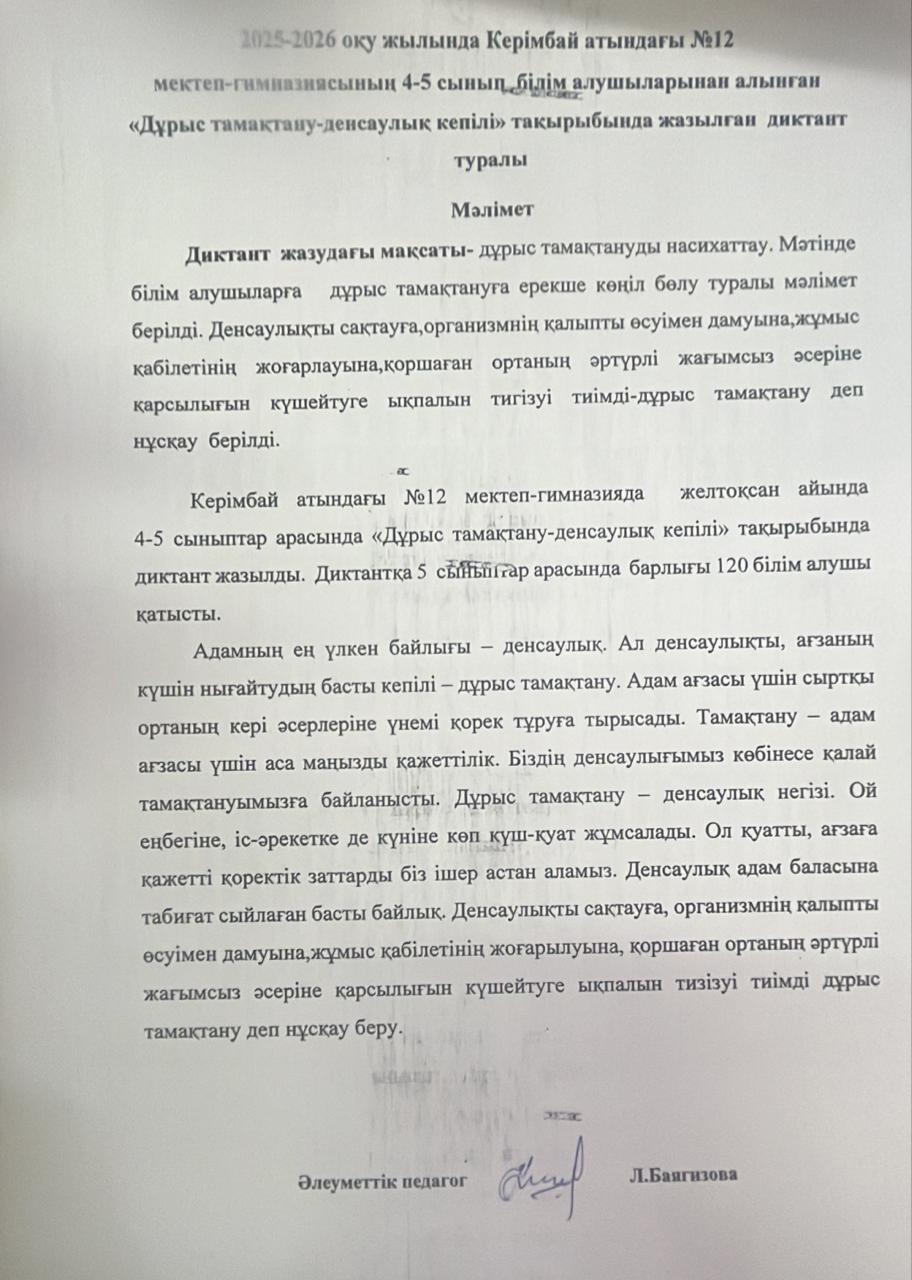 Дұрыс тамақтану-денсаулық кепілі. 4-5сыныптардан алынған диктант » СШ №12